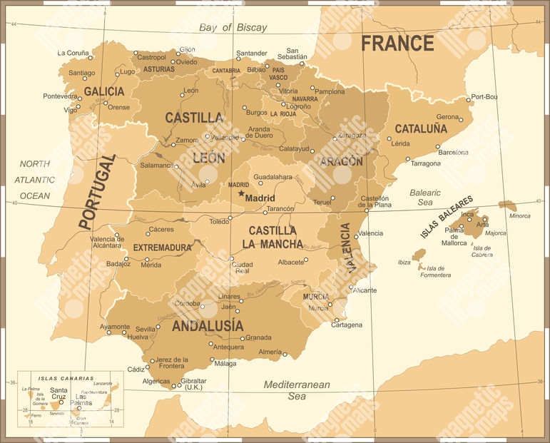 Carte magnétique de l'Espagne, vintage, beige