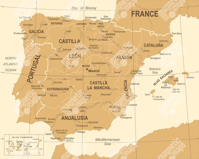 Carte magnétique de l'Espagne, vintage, beige