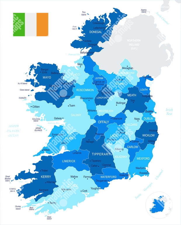 Carte magnétique de l'Irlande, DETAILLEE, bleu