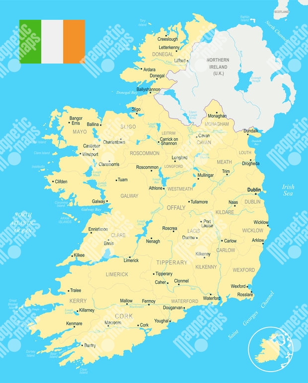 Carte magnétique de l'Irlande, DETAILLEE, jaune-bleu