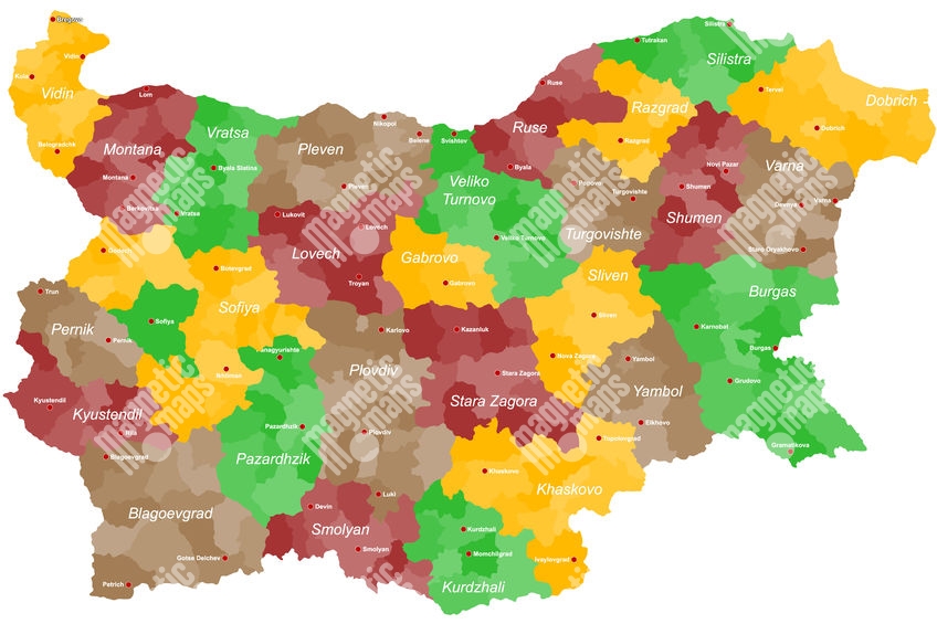 Carte magnétique de la Bulgarie, administrative, COLOREE