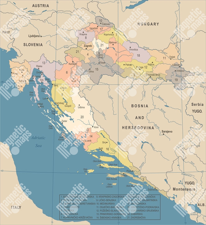 Carte magnétique de la Croatie, DETAILLEE, COLOREE
