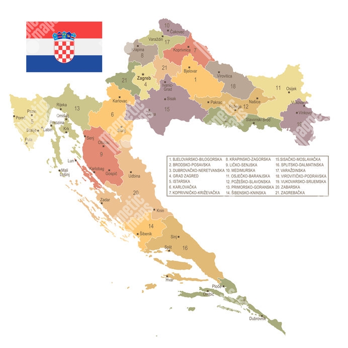 Carte magnétique de la Croatie, DETAILLEE, COLOREE