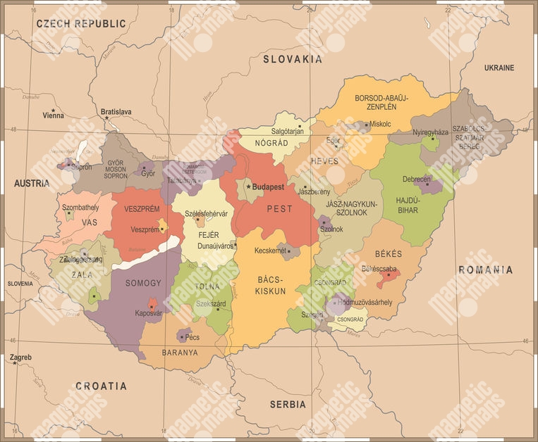 Carte magnétique de la Hongrie, vintage, détaillée