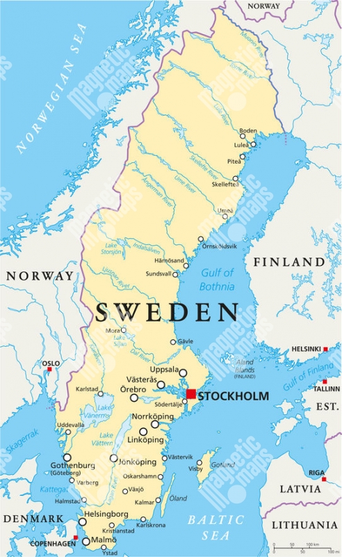 Carte magnétique de la Suède, politique, beige