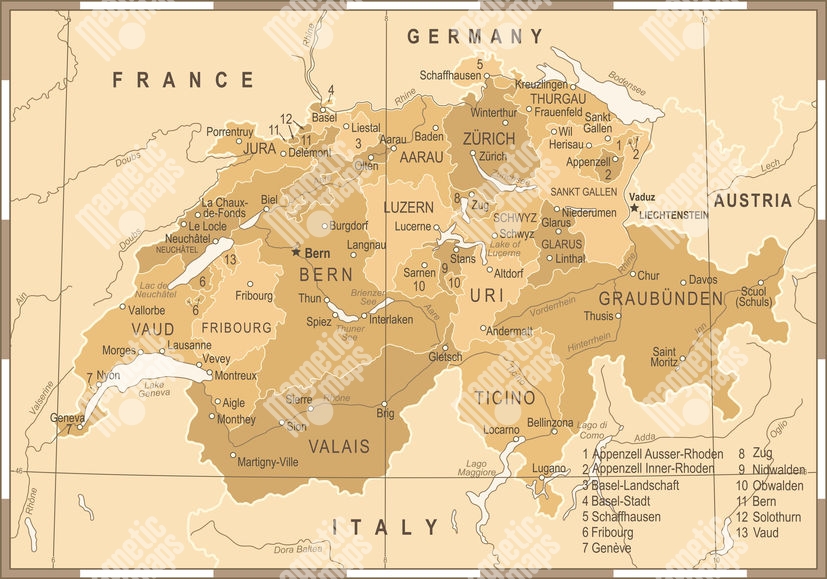 Carte magnétique de la Suisse, illustré, brun