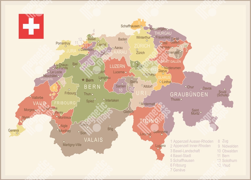 Carte magnétique de la Suisse, illustré, COLOREE