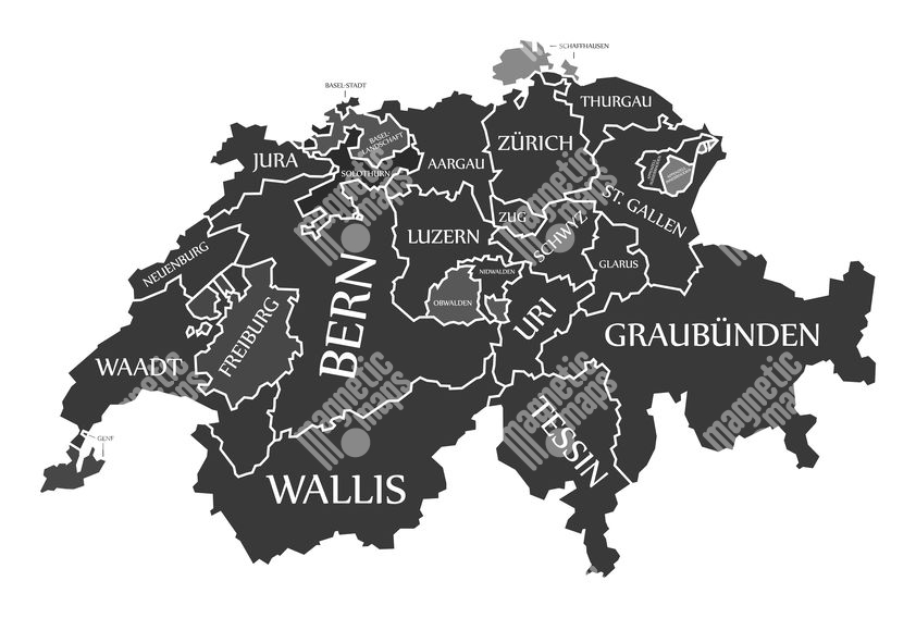 Carte magnétique de la Suisse, illustré, noir