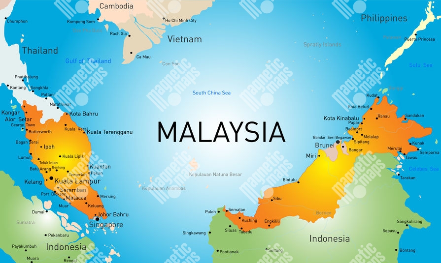 Carte magnétique de Malaisie, illustré, COLOREE
