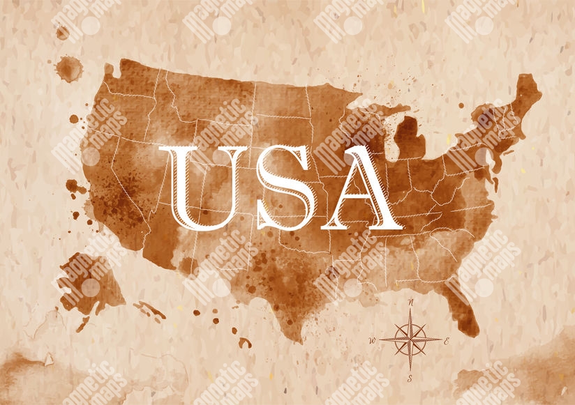 Carte magnétique des États-Unis d'Amérique, aquarelle, brun