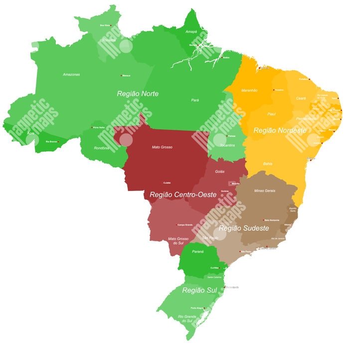 Carte magnétique du Brésil, administrative, COLOREE